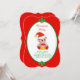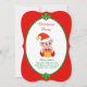 Elfo de Natal bonito vestido com convite de festas de Natal vermelho. Bela elfo, segurando um fundo de caixa de presentes. O texto está pronto para ser personalizado.
