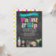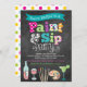 Nosso convite de estilo quadro negro para festa de pintura e bebida é o convite perfeito para qualquer evento de pintura e vinho. Nosso design apresenta um fundo de quadro negro, uma mistura de letras de padrões divertidos, como bolinhas, listras e chevron, e ilustrações e gráficos de arte, como uma paleta de artista, garrafa de vinho, taça de vinho e margarita!