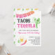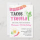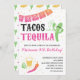 Convite tema Tacos e Tequila. Personalize o texto editável e use o convite para qualquer evento. O design pode ser usado para um chá de panela, anúncio de noivado, festa de Cinco de Mayo, Fiesta e muito mais! Apresenta um cacto divertido, copo de shot de tequila, pimenta malagueta quente e mais elementos de festa.