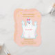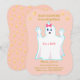 Convite de fantasma fofo para chá de bebê. Há um padrão de bolinhas douradas em fundo rosa coral no verso. Todos os textos e números estão prontos para serem personalizados.
