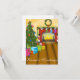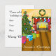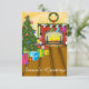 Mande alegria de Natal com uma bela cena de Natal de uma sala com coroa sobre o incêndio pendurada com meias coloridas, e uma bonito árvore de Natal com presentes.