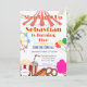 Venha! Convide seus convidados para o maior espetáculo da terra com este convite moderno e caprichoso com tema de carnaval. O design apresenta um colorido topo de tenda e uma roda-gigante alegre, cercada por todos os seus lanches favoritos de feira, como pipoca, cachorro-quente e uma bebida de carnaval. Este convite personalizável é perfeito para a festa de aniversário de uma criança e prepara o cenário para um dia cheio de jogos, guloseimas e diversão!