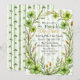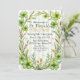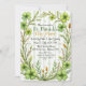 Um convite elegante com tema de trevo, emoldurado por folhagens verdejantes e sutis acentos listrados. Todo o texto é personalizável, e o padrão correspondente aparece no verso.