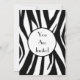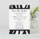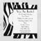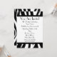 Um convite simples com um design de estampa de zebra na parte superior e inferior da frente. Corte preto e fonte Parisiense preta. Personalize com detalhes da sua ocasião. O lado oposto apresenta um design sólido com uma forma circular no meio, enquadrando o texto.