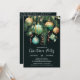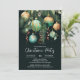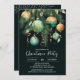 Convites elegantes de festa de Natal apresentam ramos de pinheiro, ornamentos de bolas de Natal verdes e dourados e fitas em um fundo verde escuro com seus detalhes em letra chique, perfeito para sua reunião festiva de Natal. Itens CORRESPONDENTES em nossa coleção.