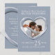 Convite de 25 anos de aniversário de casamento de prata. Lindo efeito líquido prateado em um gráfico impresso em forma de coração convite de 25 anos de casamento de prata. Personalize com os detalhes da sua festa de prata e foto do casal. O 25º aniversário de casamento é tradicionalmente associado à prata e o coração simboliza o amor. Gráficos e design originais por Sarah Trett.