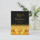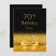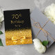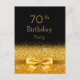 Convite de festa elegante, clássico, glamoroso e feminino. Uma fita e laço dourados com brilho e cintilação, um pouco de luxo e glamour para um aniversário. Fundo preto. Com o texto: 70º Aniversário! na frente