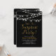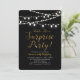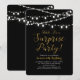 Celebre um dia especial com este convite de festa surpresa em dourado! Este design apresenta uma tipografia de roteiro elegante com uma textura de brilho dourado e cordão de luz em um fundo preto. Você pode personalizar a cor do fundo.