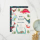 Um convite de chá de bebê de dinossauro fofo com dinossauros pintados à mão em uma selva pré-histórica de palmeiras e folhas. Para o melhor chá de bebê para menino! Arte original de Caroline Bonne Müller.