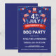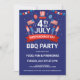 Fogos de artifício, bandeiras de estrelas e listras, balões, convite de festa de churrasco, celebração do Dia da Independência.