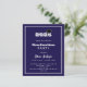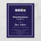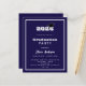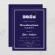 Um convite moderno e elegante para uma festa de formatura. Para ambos, ele e ela. Fundo azul, texto branco e uma moldura. Uma boina de formatura preta.