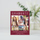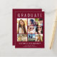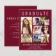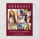 Convite de festa e anúncio de formatura moderno e econômico na cor vermelho burgundy, apresentando "GRADUATE" na parte superior em letras brancas grandes, uma colagem de sete fotos e o nome, ano de turma e escola em tipografia branca simples. No verso, adicione os detalhes da festa de formatura.