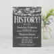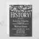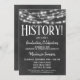 Um convite divertido de festa de formatura de história no estilo quadro negro preto e branco com luzes brilhantes no topo.