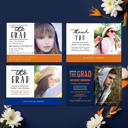Cartão com fotos de convite de festa de formatura azul e laranja personalizável para suas especificações de evento.