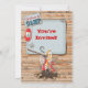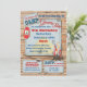 Convite de festa de Glamping divertido e fabuloso com tenda, lanterna, fogueira e marshmallow assado em papel antigo vintage contra um fundo de tábua de madeira rústica. Ótimo para noite das meninas, festa de pijama, festa de aniversário ou despedida de solteira. Ilustração desenhada à mão por McBooboo.