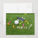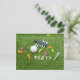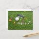 Cartão postal de anúncio de convite de festa de golfe com bola de golfe e tee verde