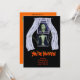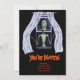 Este convite do Festa de Halloween é completamente personalizável! Convide seus convidados com este cartão. Uma alienígena assustadora atravessando uma janela aberta do quarto. Os três dedos da alienígena se abrem atrás da cortina da janela. É pele enrugada, imagens de costelas, expressão de aparência irritada, e a cortina transparente que flui dá a esta ilustração um ar de assombro assustador. A parte de trás tem a mesma imagem na arte da linha preta e tem todas as informações da festa que são simples de mudar.