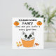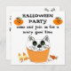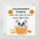 Um convite divertido para a festa do halloween. Fundo de branco com texto em letras negras. Um gato bonito tomou um copo laranja. Personalize com todas as informações de sua parte. Excelente para festas de crianças também!