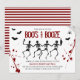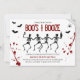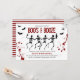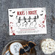 Organizando uma festa de halloween - confira este convite assustador com respingos de sangue, que apresenta esqueletos dançantes bêbados, uma teia de aranha e aranha, respingos de sangue vermelho e morcegos pretos. O título está em letra cursiva desgastada, mantendo o tema de halloween "boo's and booze" e um modelo moderno que é facilmente personalizável.