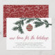 Convide amigos para celebrar em sua nova casa com nossos convites de festa de inauguração festivos e modernos. O design apresenta um ramo de pinheiro verde caçador adornado com um enfeite de bola vermelho e verde, e "nova casa para as festas" em letras de caligrafia vermelha. Adicione os detalhes da sua festa de inauguração em letras verde caçador.