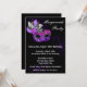 Convite de Festa de Máscaras. Um convite sofisticado e elegante com uma máscara de máscaras prateada e roxa, perfeito para uma festa de debutante ou celebração de Mardi Gras.