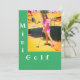 Imagem de menina jogando mini-golfe em fundo verde na frente e detalhes da festa no verso.