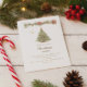 Um convite de inverno para uma festa de Natal. Uma frente com fundo branco decorada com uma árvore de pinheiro desenhada à mão com aquarela e ornamentos vermelhos e dourados. Algumas estrelas e uma grinalda de Natal decorada com cones e flores de Poinsettia vermelhas. Personalize e adicione os detalhes da sua festa.