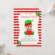 Convite de festa de Natal com fundo listrado de vermelho e branco e elfo fofo. Fofo elfo bebê segurando uma caixa de presente em fundo branco e vermelho. O texto está pronto para ser personalizado.