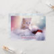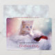 Um convite de festa de Natal com uma fotografia de um gatinho ruivo sentado em um chapéu de Papai Noel branco e vermelho macio. Luzes cintilantes desfocadas ao fundo.