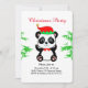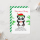 Convite de festa de Natal com adorável panda ursinho elfo em fundo branco e verde. O texto está pronto para ser personalizado.