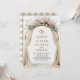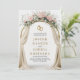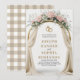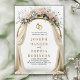 Convite de festa de noivado com desenho de arco floral elegante. Apresenta flores rosa e brancas, folhas verdes e anéis dourados. Nomes e detalhes em texto dourado.
