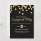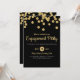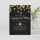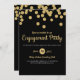 Um convite de festa de noivado com brilho preto e dourado com pontos dourados.