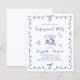 Defina o tom para uma celebração alegre com este convite de festa de noivado encantador, apresentando uma moldura ondulada em azul francês, laços desenhados à mão e letras em script divertido. Os copos de vinho para brindar alegres adicionam um toque divertido e festivo, criando a combinação perfeita de estilo romântico e caprichoso. OBSERVAÇÃO: Este papel econômico é semelhante em peso ao papel fotográfico - uma versão de papel-cartão tradicional 5x7 maior e mais grossa também está disponível (envie-nos uma mensagem para o link).