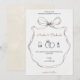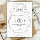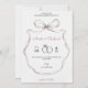Convite de festa de noivado elegante com desenho de laço, apresentando nomes, data, hora e detalhes do local em uma escrita clássica. Simples e sofisticado.
