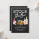 Convites de festa de noivado para casais com um fundo de quadro-negro, uma seleção de cervejas e vinhos em aquarela, o ditado "abasteça o bar", e um modelo de texto moderno que é fácil de personalizar.