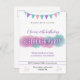 Convite de aniversário elegante e divertido para uma festa de pijama de menina ou adolescente. Um efeito de brilho moderno e cores pastéis bonitas em rosa, roxo e azul/teal são usadas na letra, e o design é finalizado com uma estrela roxa. Personalizável para personalizar com todos os detalhes da sua festa.
