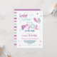 Um convite de festa de piscina divertido em um esquema de cores rosa e roxo com um design listrado na parte de trás. Perfeito para a celebração do aniversário de uma menina no verão!