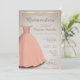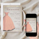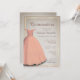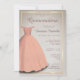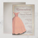 Este convite de festa/celebração de quinze anos apresenta um lindo vestido rosa claro em um fundo bege com uma moldura dourada (não foil).