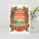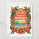 Convite colorido de festa de reggae com pôr do sol em uma ilha cercada por flores tropicais