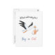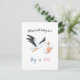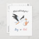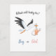 Convite de festa de revelação de gênero. Uma cegonha está carregando um bebê em um embrulho. O bebê está tirando uma selfie usando um celular.