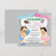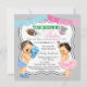 Convites de revelação de gênero Touchdowns ou tutus para baby shower com adorável bebê moreno de cabelo escuro menino e menina em um lindo fundo cinza com listras e faixas rosa e azul. Esses convites de baby shower Touchdowns ou tutus são facilmente personalizados para o seu evento, basta adicionar seus detalhes.