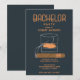 Convite de festa de solteiro em um design laranja e azul marinho com charuto e copo de uísque. Personalize com os detalhes da sua festa.