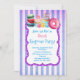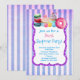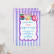 Definido em um fundo listrado rosa-rojado em estilo desgastado e xadrez. Uma moldura chique com uma borda roxa com bolinhas brancas adiciona um toque de fantasia a este convite. Uma coleção de doces fica no topo, incluindo cupcakes, donut, macarons e doces redondos coloridos. Personalize com todos os detalhes da sua festa.