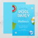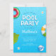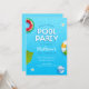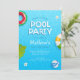 É um convite de festa de verão moderno e fresco. Melhor para convite de festa de aniversário de verão. Tem folhas de palmeira e piscina azul com tipografia divertida. Todo o texto é facilmente personalizável.