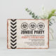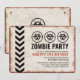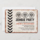 Convite com visual retrô para uma festa temática de surto de zumbis com uma placa desgastada e símbolos de risco biológico.