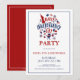 Convite de festa com símbolos do Dia da Independência e texto personalizado em vermelho e azul sobre um fundo branco. Comida, diversão e fogos de artifício.