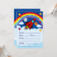 Convites de festa do navio espacial para qualquer ocasião. Brilhante navio espacial vermelho irrompendo através de nuvens brancas fofas para voar sobre alguns planetas felizes e um arco-íris colorido e estrelas. Use o convite como está ou substitua o texto em qualquer um dos modelos.