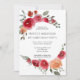 Convite de aniversário floral boêmio rústico elegante aquarela com rosas e folhagens em cores vivas e vibrantes em pêssego, rosa e burgundy. Fundo marsala burgundy. Pode ser personalizado.