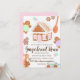Uma adorável casa de pão de gengibre pingando de glacê branco nevado e enfeites de doces pastéis. Janelas cor-de-rosa bonitas e uma porta arqueada em uma moldura marrom de especiarias de canela. Gomas, biscoitos de gengibre, chocolate quente e uma colher de pau enquadram o texto do convite.