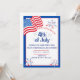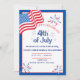 Convite de festa de celebração do dia 4 de julho com bandeira dos EUA e fogos de artifício.